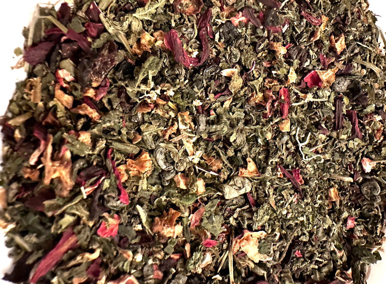 • Hibiscus & Elderflower – Immune-boosting and soothing for respiratory health.