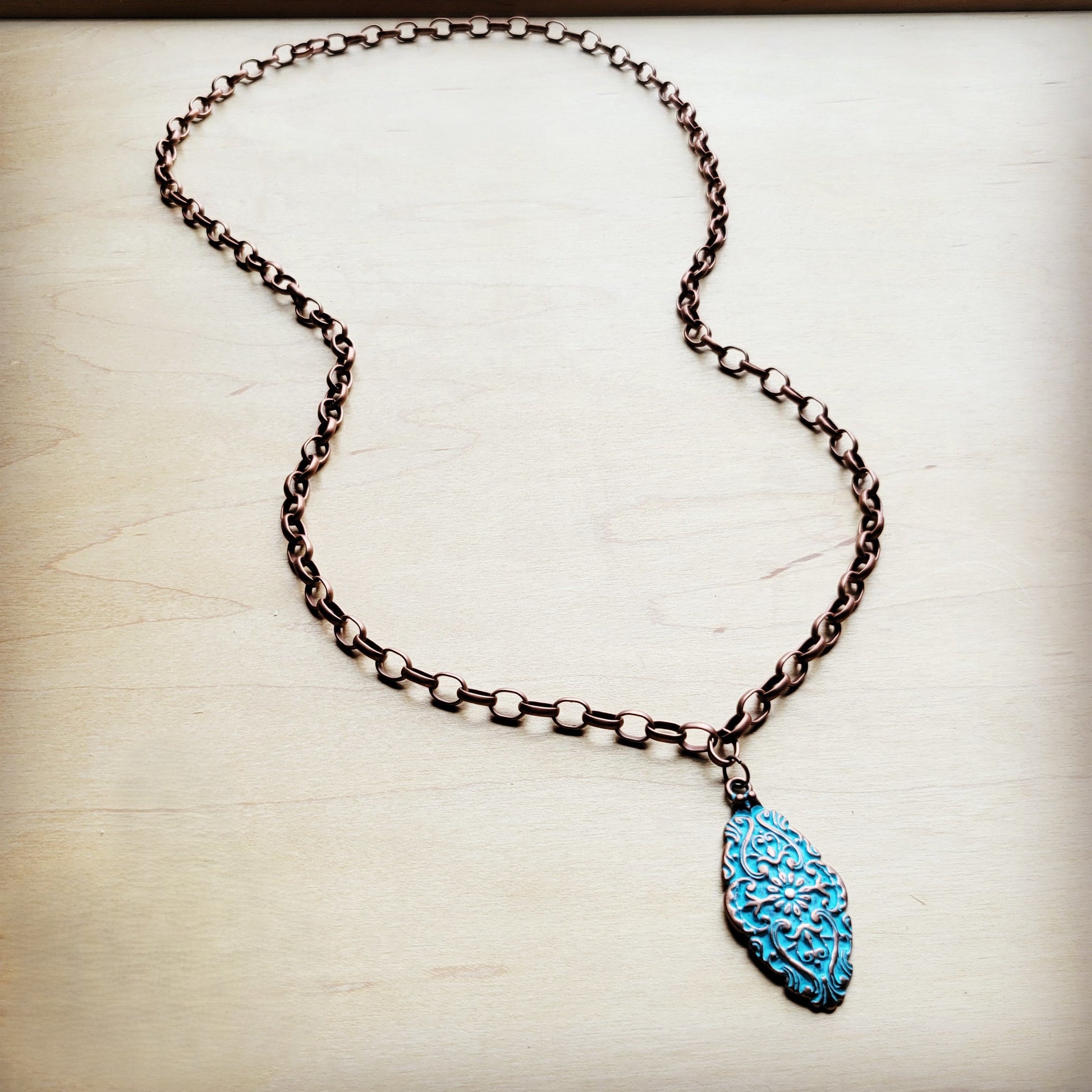 Elevate your style with our Long Copper Layering Necklace featuring a delicate filigree pendant with burnished finish. This boho jewelry piece adds a touch of elegance to any outfit. Crafted with expert precision, our necklace is the perfect accessory for any occasion.