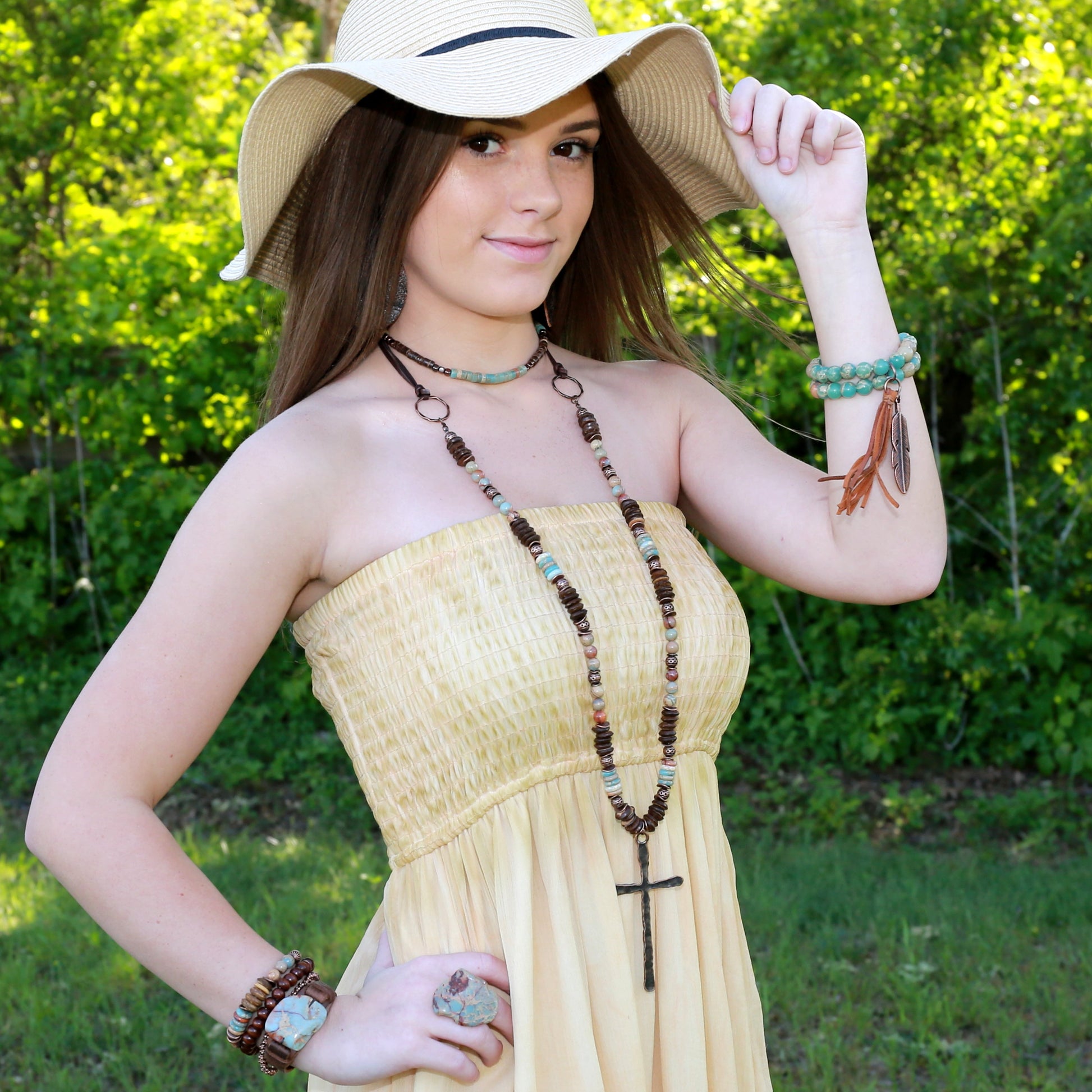 This double strand beaded bracelet features genuine stones and leather for a boho western look. Perfect for layering and adding a touch of natural beauty to any outfit. Handmade with a tassel for added texture.