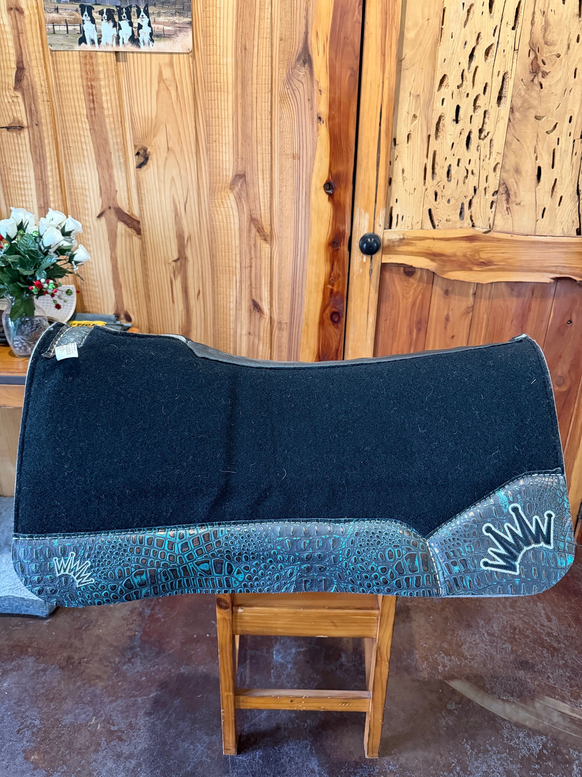 The classic black wool body delivers a sleek, professional look, while the Sea Turquoise premium wear leathers add a striking pop of color that stands out in every arena. Durable, eye-catching, and meticulously crafted, this pad brings together both function and style in one powerhouse design.