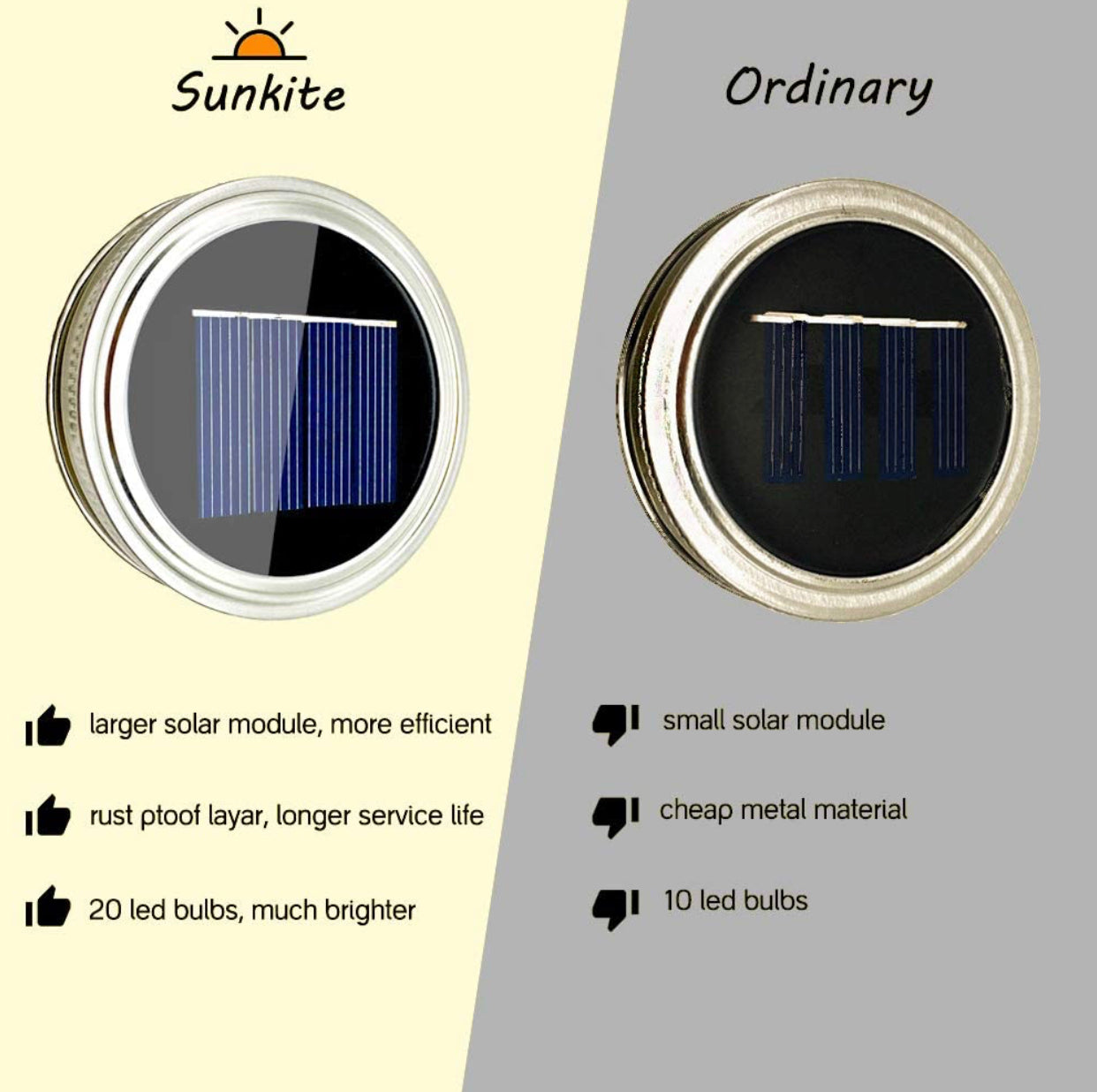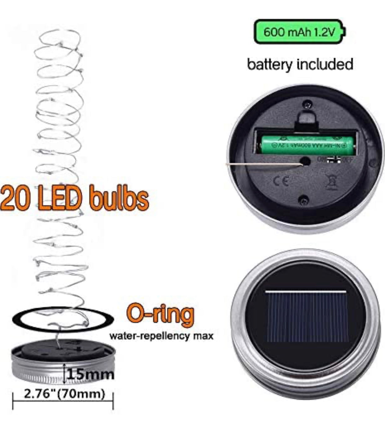- 👍UPDATED MASON JAR LID LIGHTS - Cozy warm Lights, with 20 micro LED, much brighter than those 10 LED jar lights. Larger solar panel, charge more efficiently. The edge of the lid uses rustproof material instead of cheap alloy, you would find it more durable in humid weather.