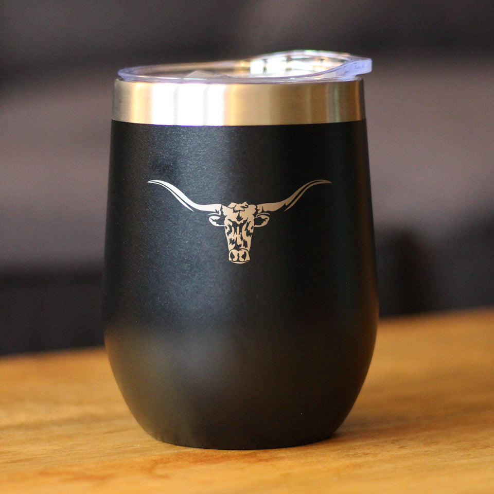 Longhorn - Wine Tumbler Glass with Sliding Lid - Stainless Steel Insulated Mug - Western Themed Farm Decor and Gifts for Texan Ranchers