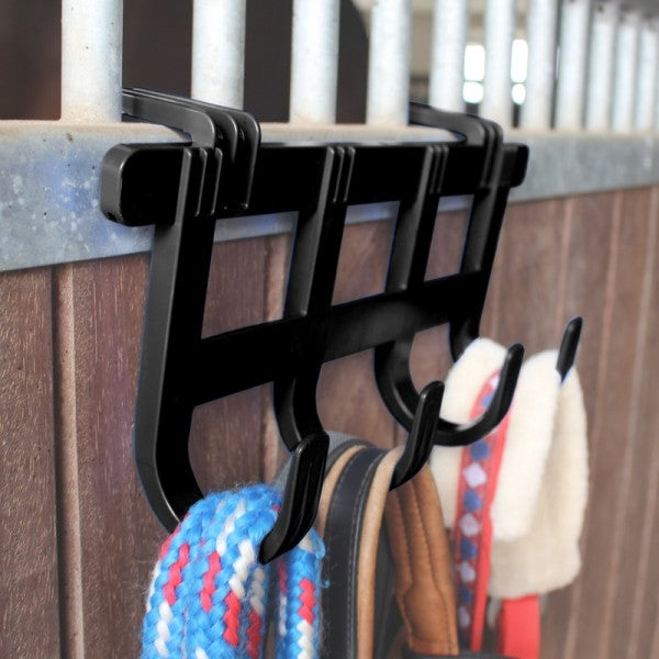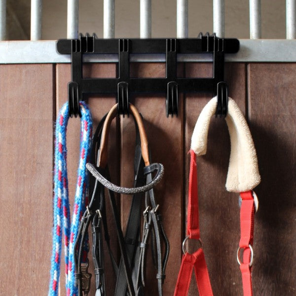 Useful rack with hooks for many stable accessories. You can store holsters, ropes and snaffles readily available. Great for horse shows and boarding barns.