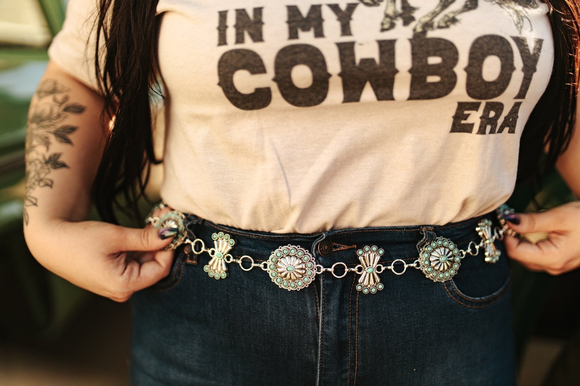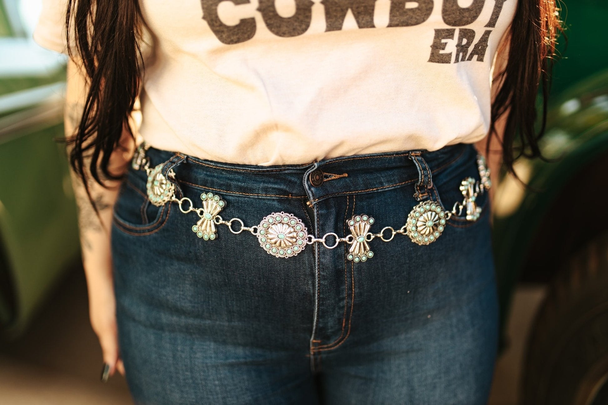 Wear a piece of pure beauty around your waist! This eye-catching accessory features exquisite squash blossom accents adorned with beautiful turquoise stones, all gracefully strung along a stylish chain. Add a touch of Western charm to your outfit and make a statement that turns heads!